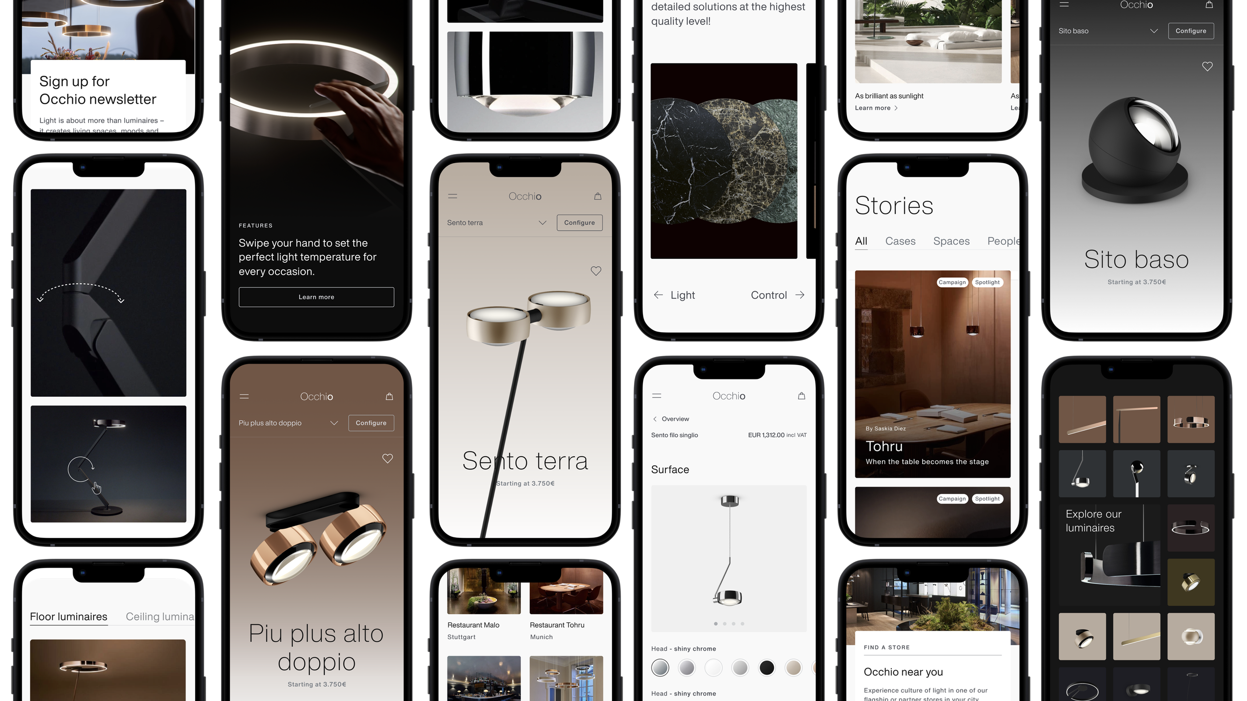 We worked closely with Occhio executives to better understand their business needs and conducted user research with Occhio’s B2B and B2C customers to define a vision for a future digital brand experience. We brought this vision to life through a user-centric product experience and a holistic design system, creating magical moments through UI interactions and content to help users fall in love with the Occhio brand.